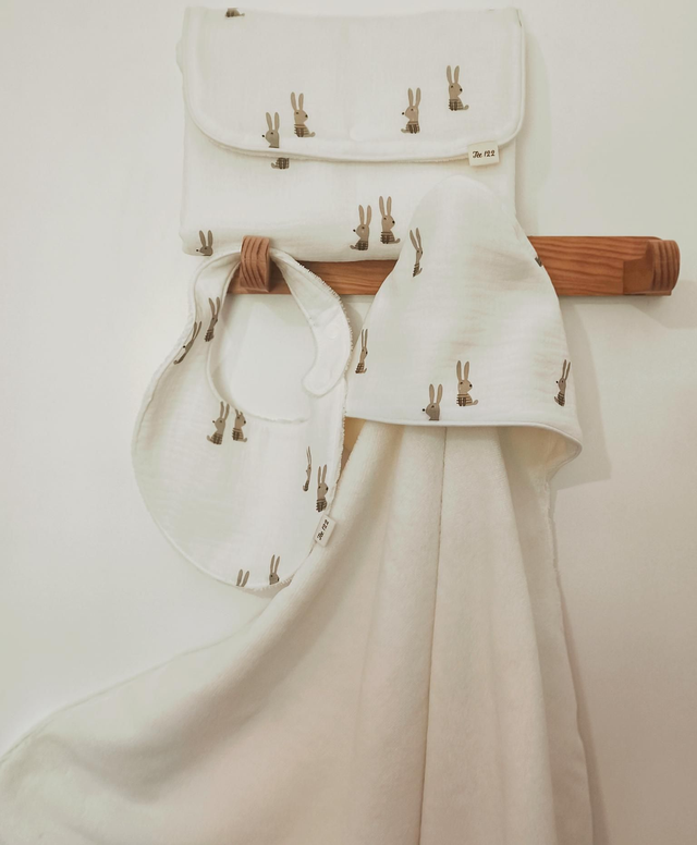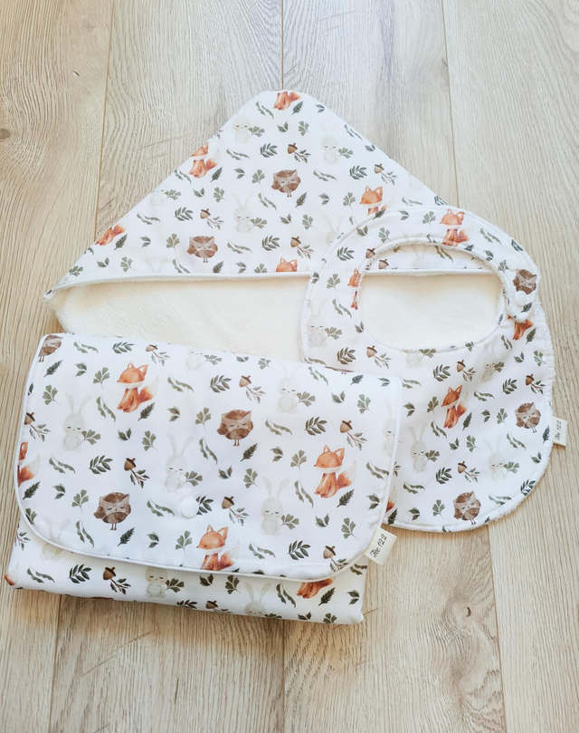 Le pack soins, avec des petites affaires très utiles. Idéal comme cadeau à de futurs jeunes parents. Il contient: - Un tapis à langer nomade, pliable et compact. Vous accompagnera partout lors de vos sorties. Il est doté d'un tissu imperméable pour parer à toutes fuites et d'un tissu en micro éponge très douce pour la peau du bébé. - Un bavoir (0-2 ans), avec une fermeture sur le côté, très pratique pour limiter les manipulations du coup du bébé. - Une cape/sortie de bain, en micro éponge ultra douce pour prendre soin de la peau de votre bébé (taille 0-2 ans)
